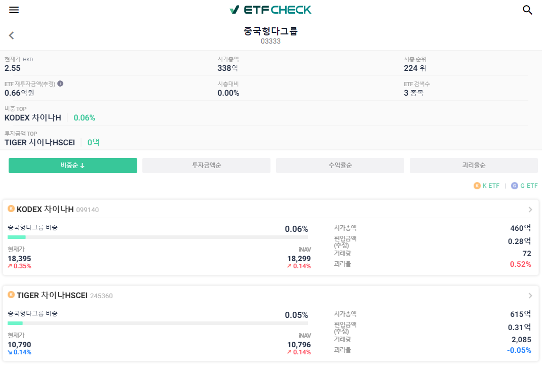 레버리지ETF 제외하고 KODEX차이나H 에서 0.06% 비중이며 TIGER차이나HSCEI 에서는 0.05%입니다.